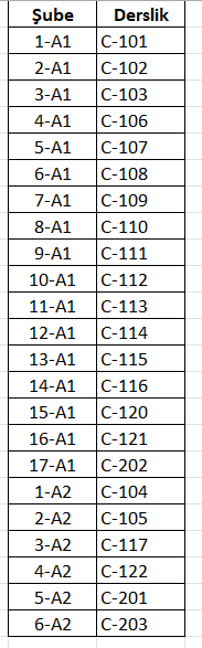 2025-2026 Akademik Yılı 1. Modül Şube-Derslik Listesi